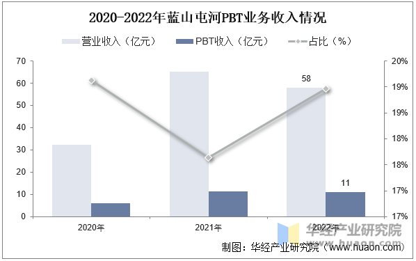 新疆蓝山屯河科技股份无限公司以精细化工和高端化工新材料一体化财产链为从业,自成立以来不竭建牢财产链硬件根本,建成“BDO-PBS系列生物降解材料/PBT/PTMEG/TPEE”上下逛一体化财产链,产物线涵盖精细化工根本原料、生物降解材料、化工新材料以及新型节能环保建材等,据统计,截至2022年新疆蓝山屯河科技股份无限公司停业收入为58亿元,此中PBT营业收入为11亿元,占比18。96%。