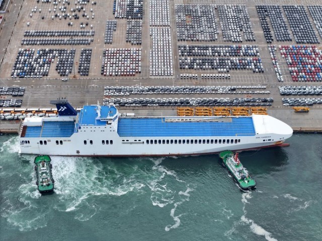 6月29日,汽车运输船停靠山东口岸烟台港,预备拆运出口汽车(无人机照片)。发(唐克 摄)“我国进出口曾经持续9个季度运转正在10万亿元以上,本年上半年进出口比客岁上半年添加了6000多亿元。进入6月份,进出口、出口、进口这三项目标同比全数实现正增加,并且增速都正在回升。”海关总署副署长王令浚暗示。